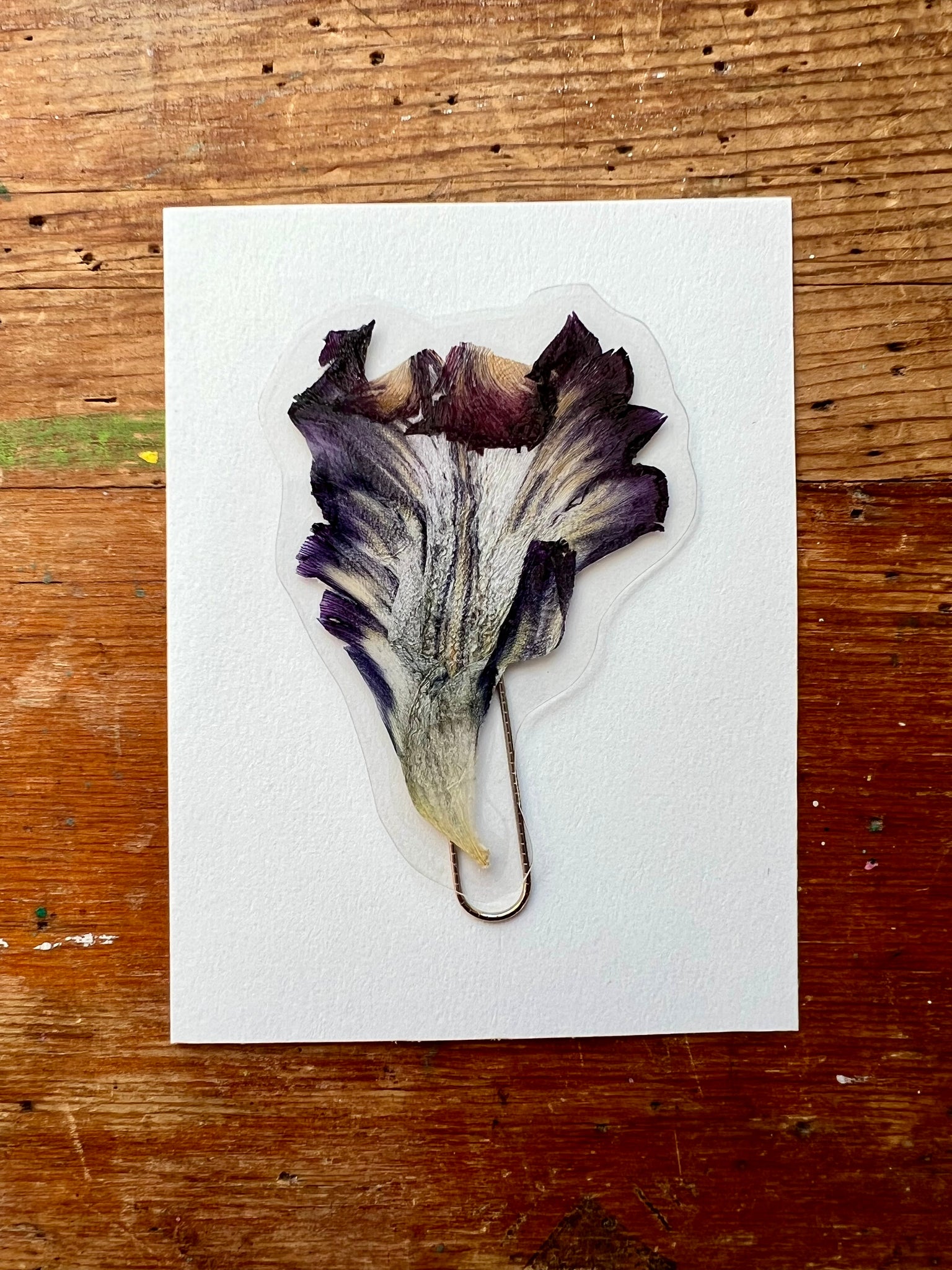 I have been pressing flowers since age six. Over the years I made lovely pressed flower art to hang on the wall. This time I am offering a limited edition of pressed iris flowers and hand painted leaves as bookmarks.